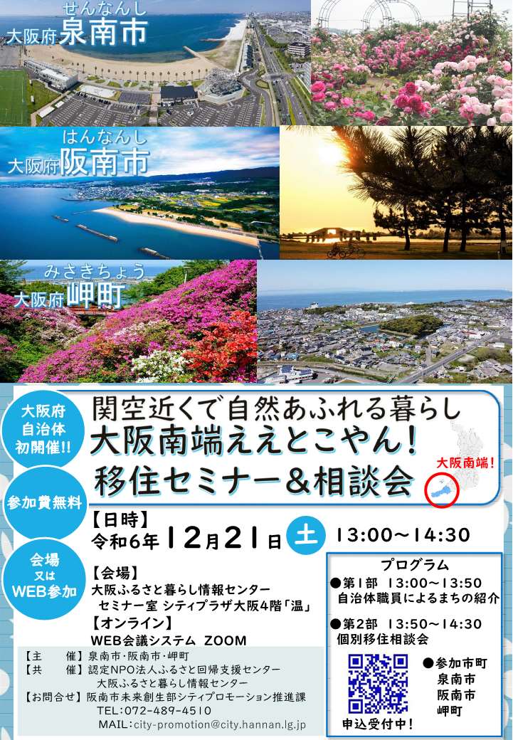 関西国際空港が近く、大阪府内でありながら海・山自然が豊かな市町の魅力や、まちの紹介をしました。当日の移住セミナーの様子を動画で掲載していますので、是非ともご覧ください。